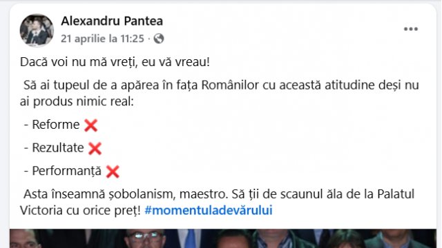 Eșaloanele inferioare ale partidului par însă să rămână pe poziții. Spre exemplu, Iulian Alexandru Pantea, directorul ANIF Arad, și-a manifestat clar, pe Facebook, poziția anti-Bolojan și solidaritatea cu membrii de partid care aveau să voteze la referendumul intern pentru ieșirea de la guvernare în ipoteza în care Bolojan rămâne șeful Guvernului. Asta, după ce, tot pe Facebook a avut postări favorabile fostului ministru social-democrat al Agriculturii, Florin Barbu. Nu spunem că este bine sau rău, dar nu putem să nu observăm că a ales să rămână, cel puțin pentru moment, în administrația condusă de un prim-ministru împotriva căruia s-a pronunțat cu subiect și predicat, iar cei pentru care și-a manifestat deschis sprijinul au făcut o alianță cu AUR pentru a-l da jos.
