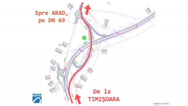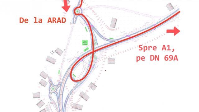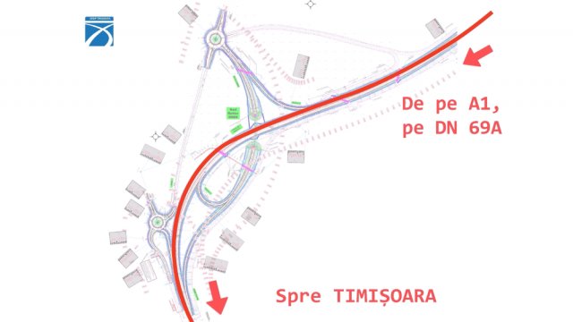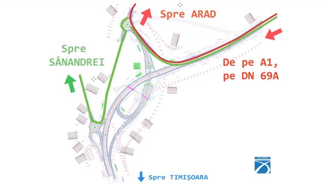 • Timișoara – Orțișoara – Arad (DN 69): șoferii urcă pe pasajul care traversează DN 69A și ies în sensul giratoriu nord, spre Orțișoara/Arad.