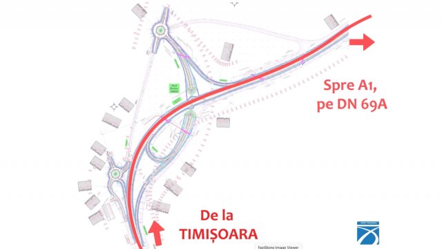 • Acces industrial: breteaua a doua din sensul giratoriu sud duce exclusiv spre platforma industrială, fără acces în DN 69 spre Timișoara.