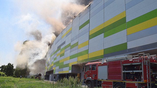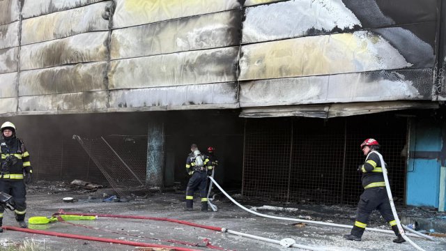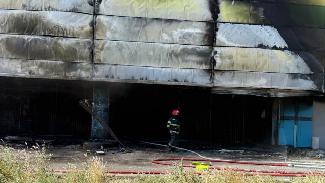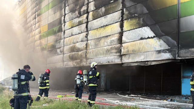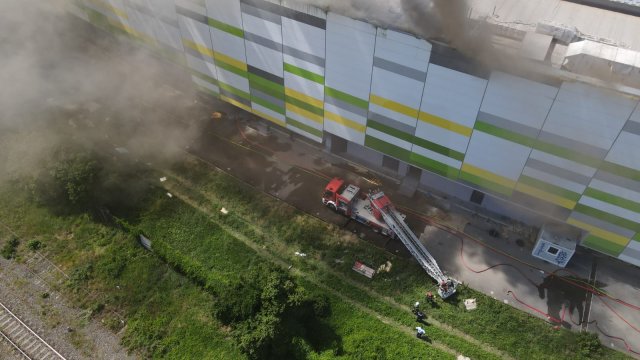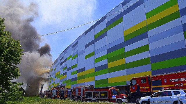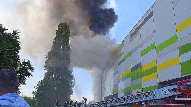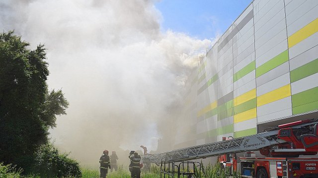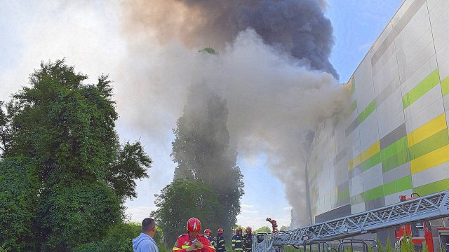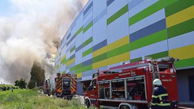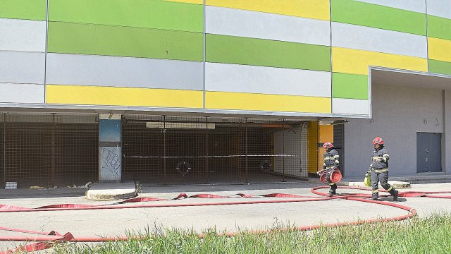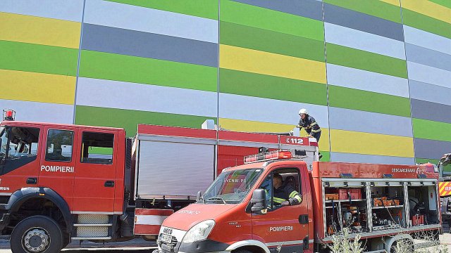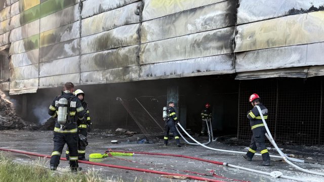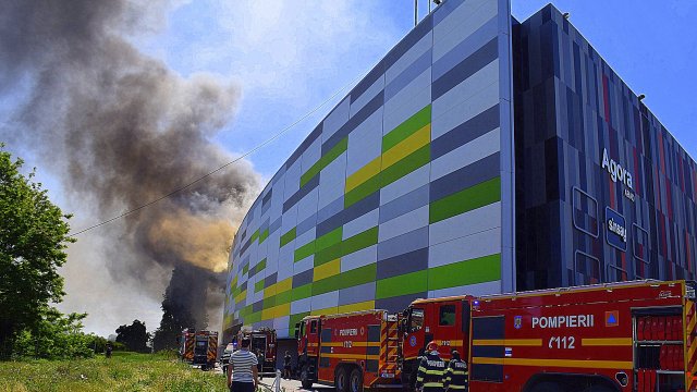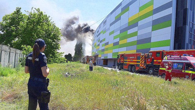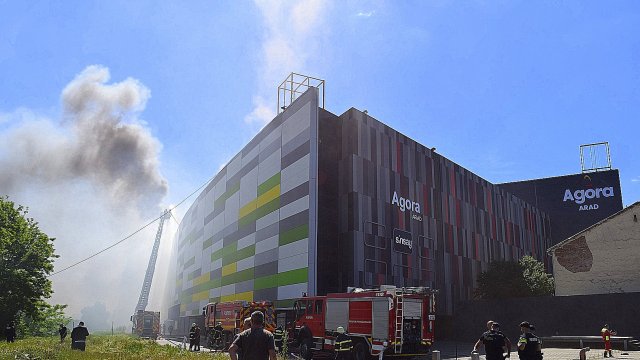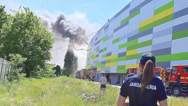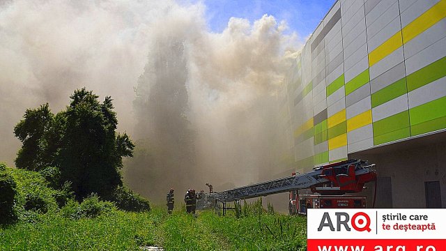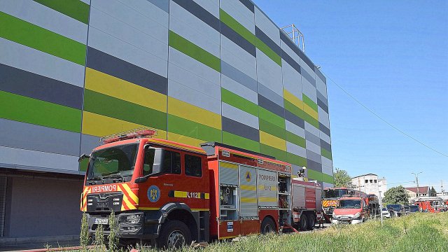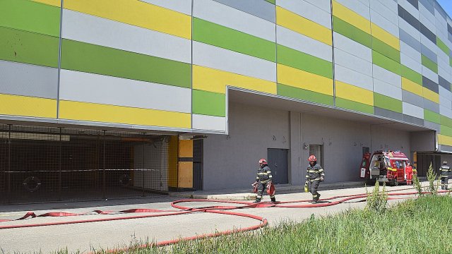 Incendiul se manifestă violent la deșeuri menajere aflate în curtea centrului comercial, și în interiorul centrului comercial.