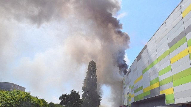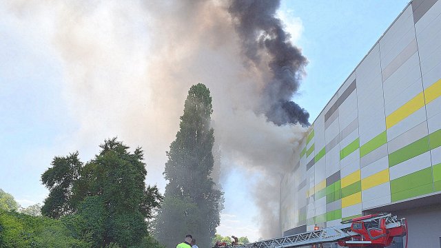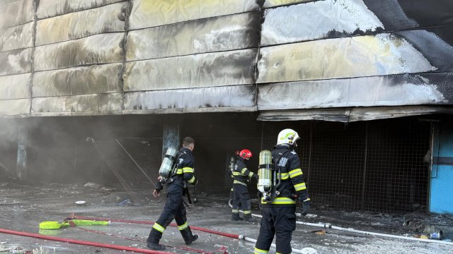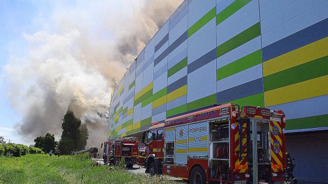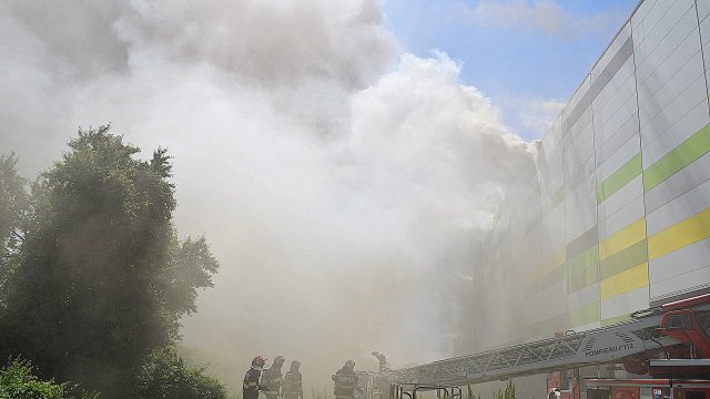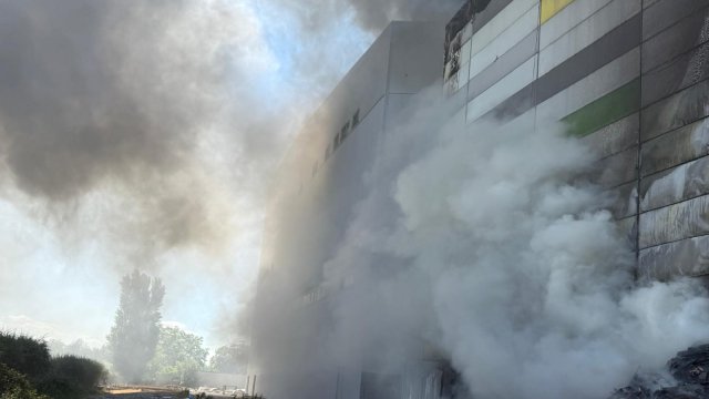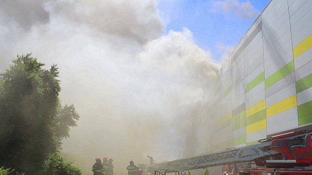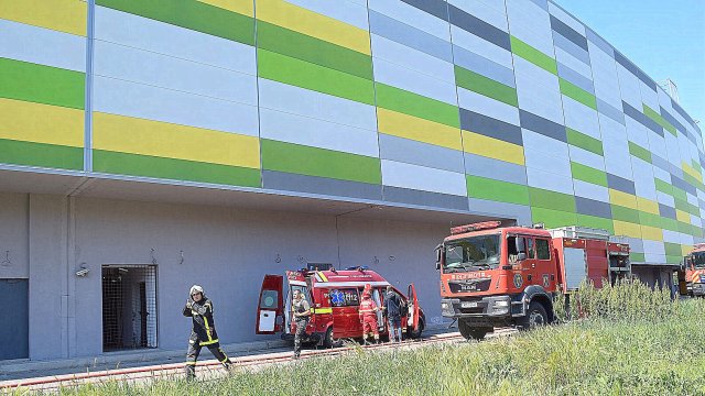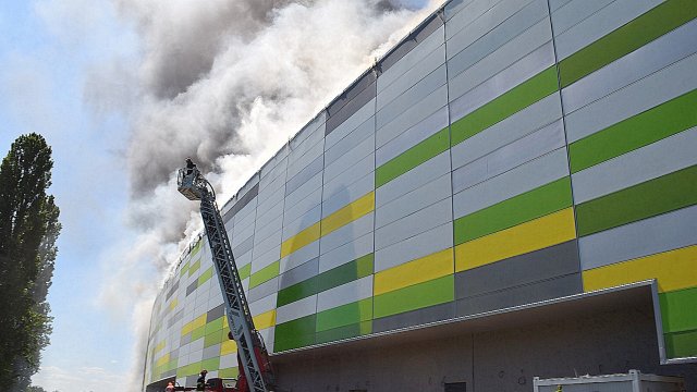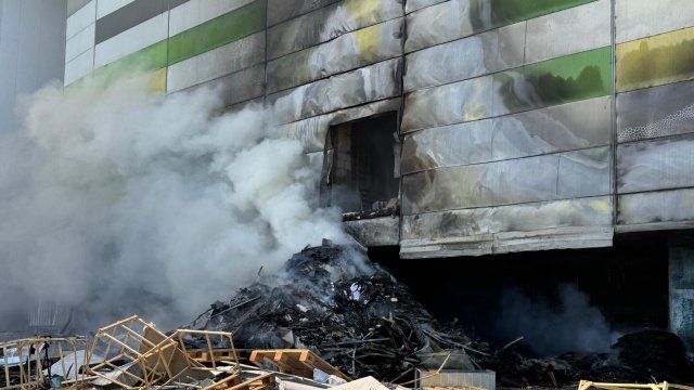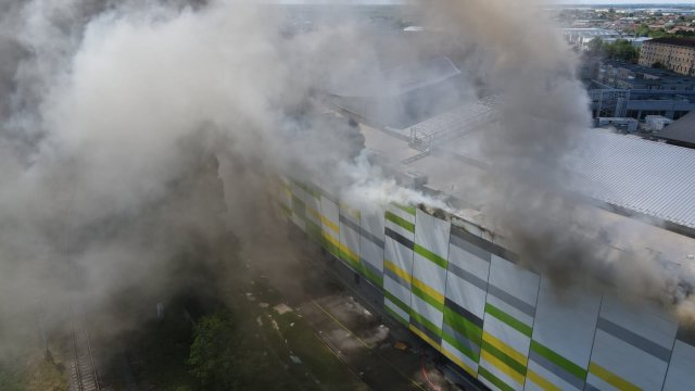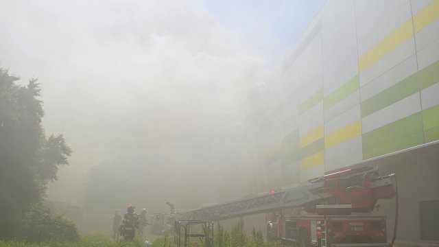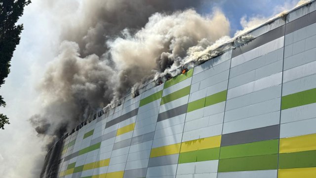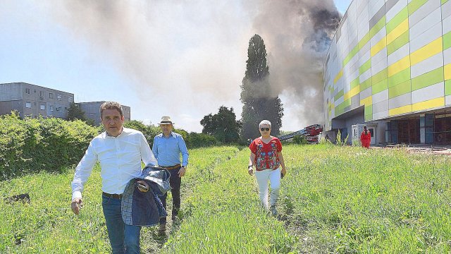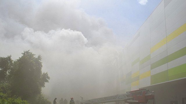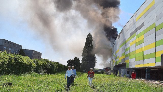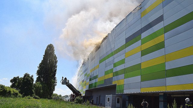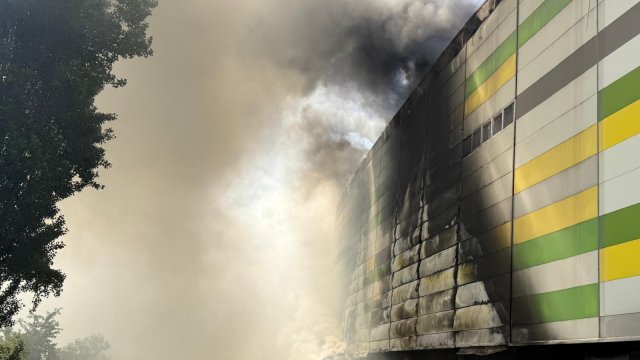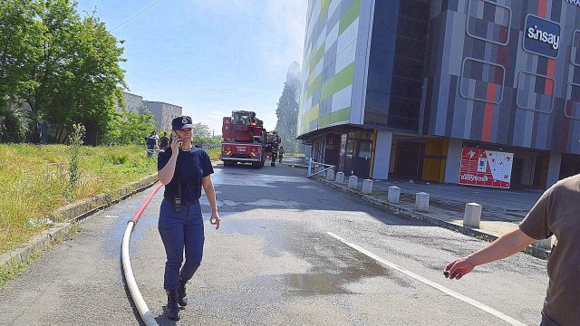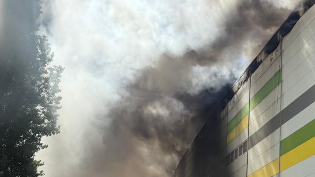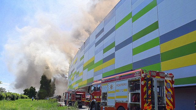 Incendiul se manifestă violent la deșeuri menajere aflate în curtea centrului comercial, și în interiorul centrului comercial.