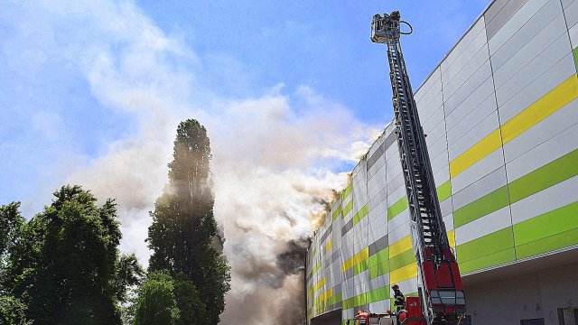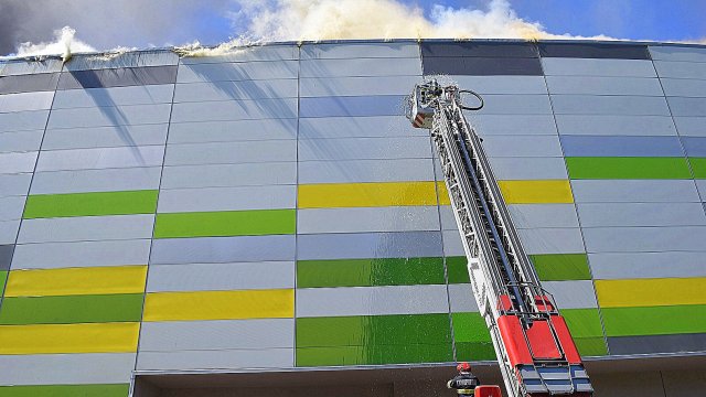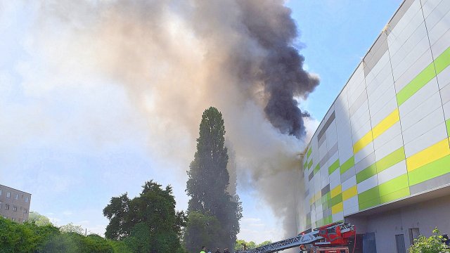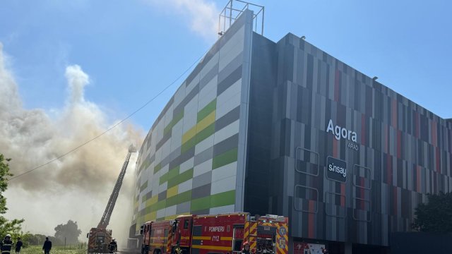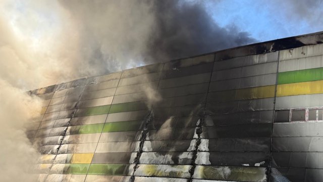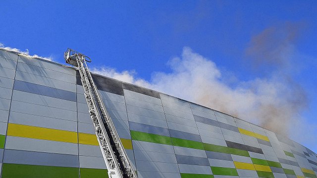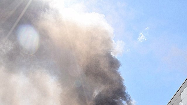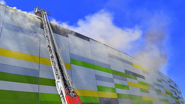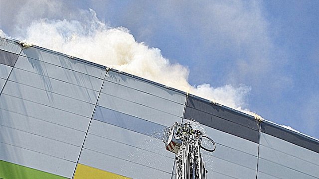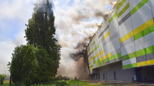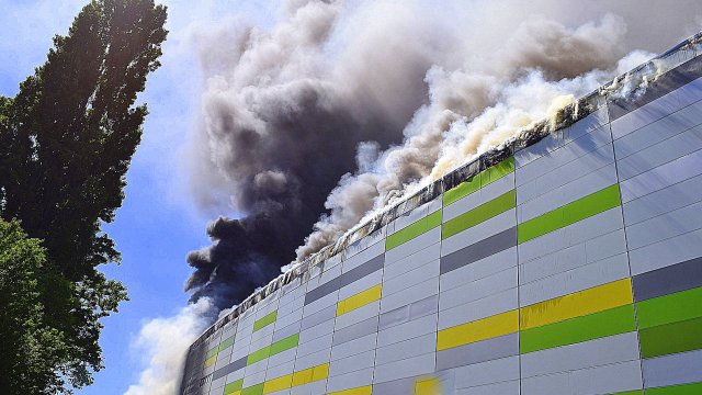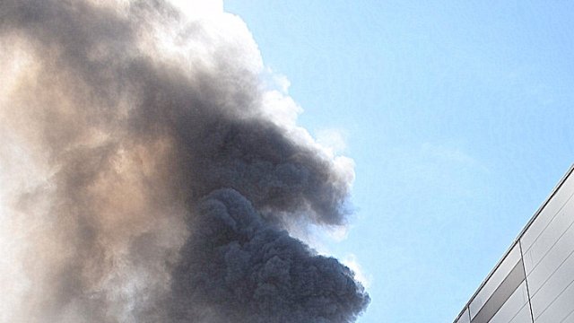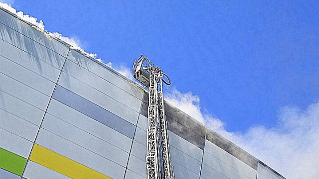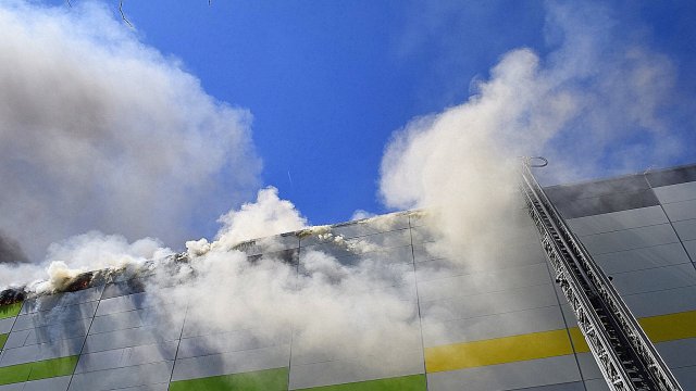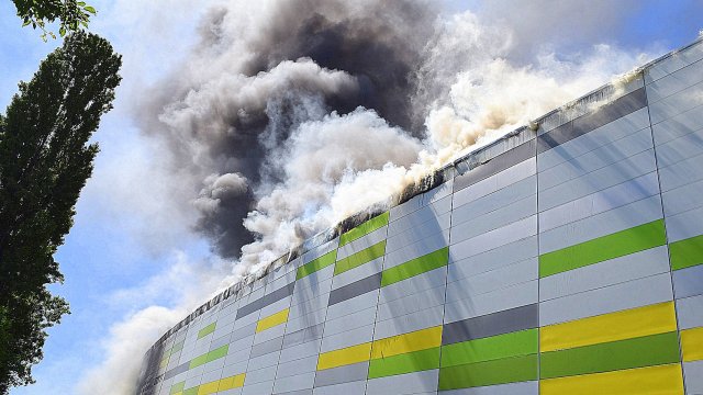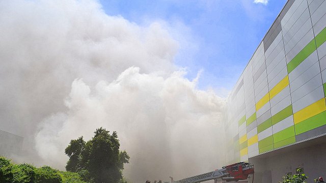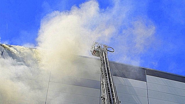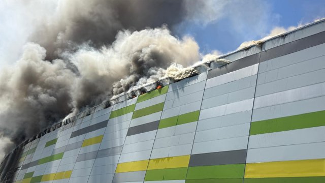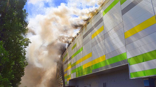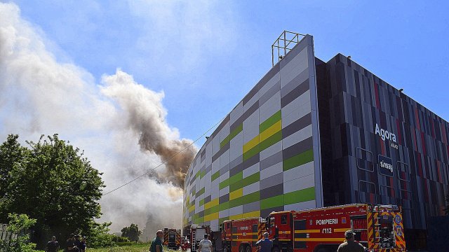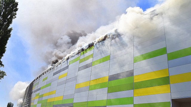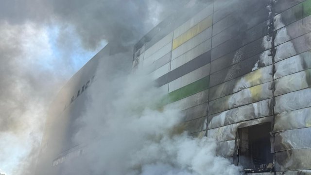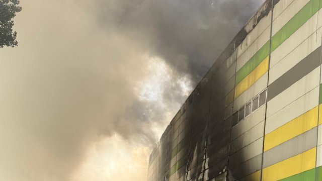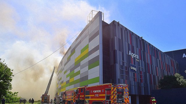 Incendiul se pare că se extinde din spatele mall-ului, pe acoperiș, înspre partea din față a construcției.