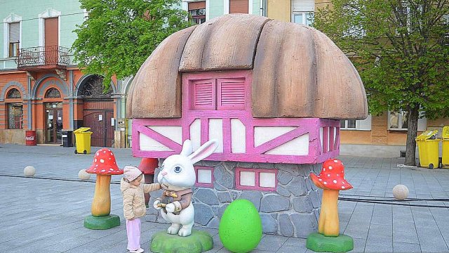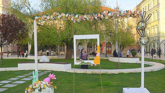 Pe platoul din fața Catedralei Ortodoxe Vechi sunt amplasate decorațiuni tematice dedicate Sărbătorilor Pascale, contribuind la crearea unei atmosfere festive pentru toate vârstele.