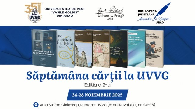 Universitatea de Vest „Vasile Goldiș” din Arad, prin Editura „Vasile Goldiș” University Press, organizează în perioada 24–28 noiembrie 2025, cea de-a doua ediție a „Săptămânii Cărții la UVVG”, un eveniment dedicat promovării culturii scrise, dialogului interdisciplinar și lansărilor editoriale. Universității i se alătură Biblioteca Județeană „Alexandru D. Xenopol” Arad, care este invitatul special instituțional al acestei ediții.