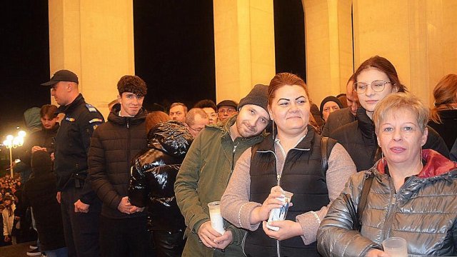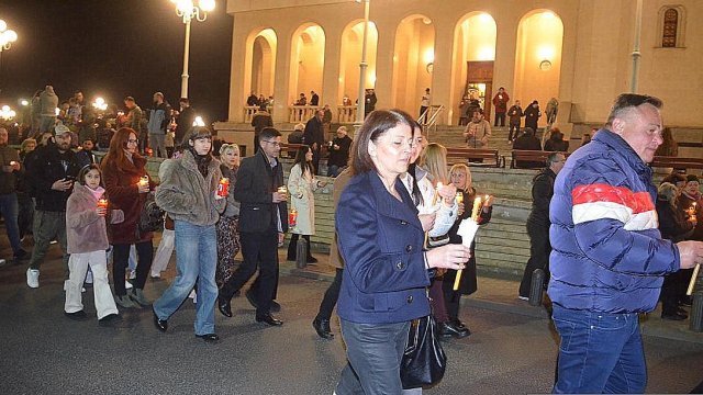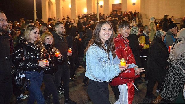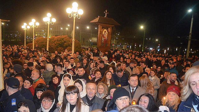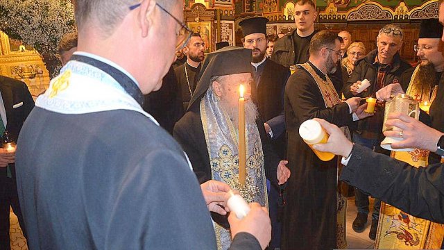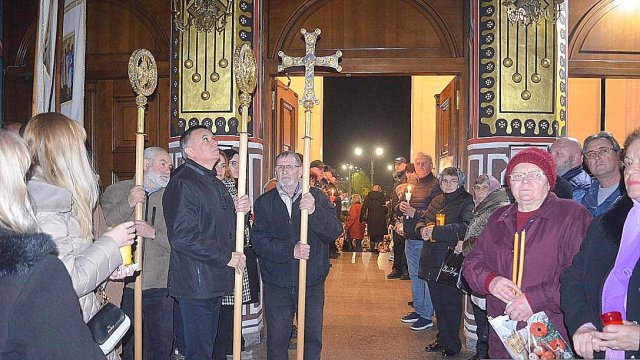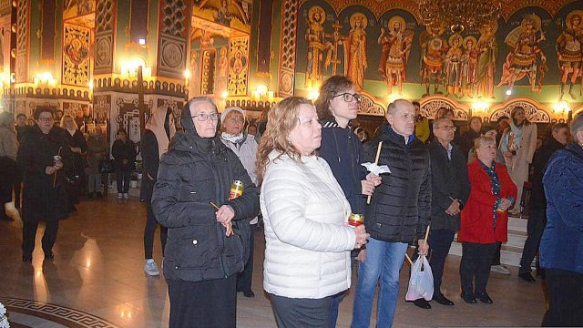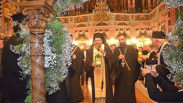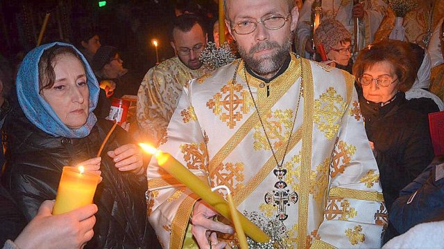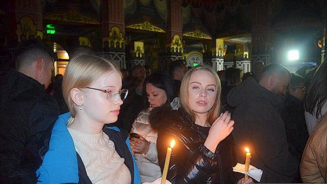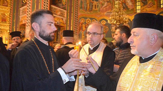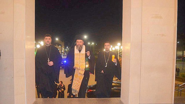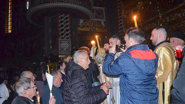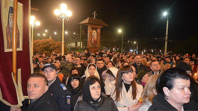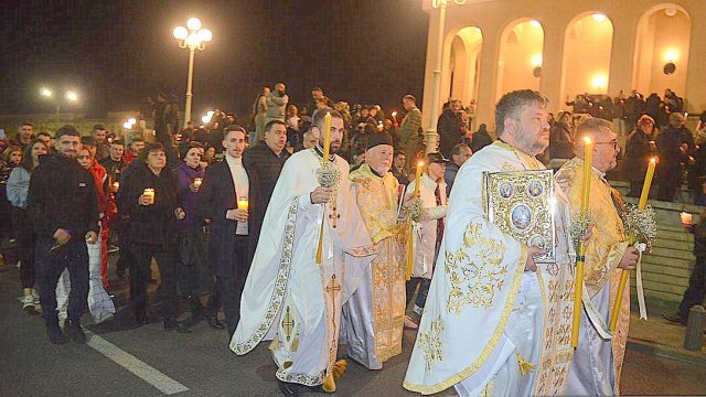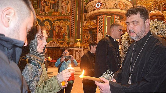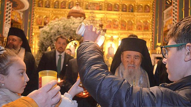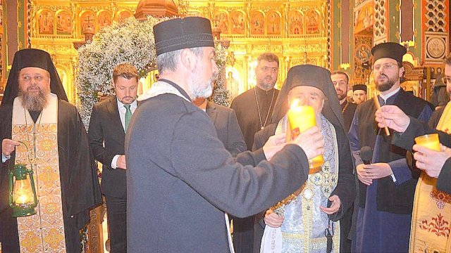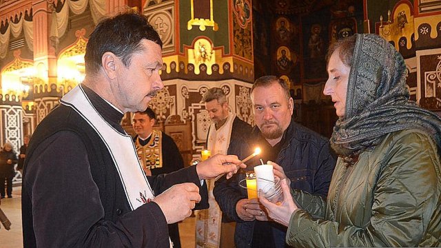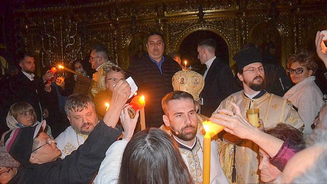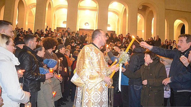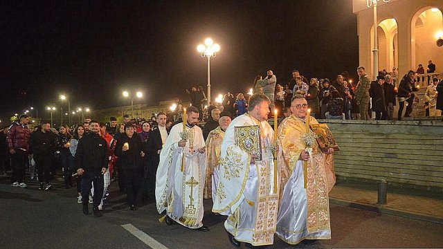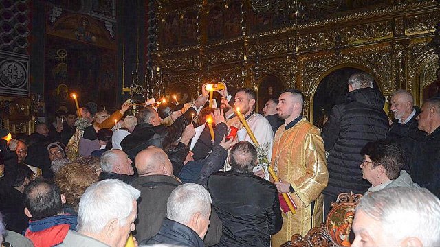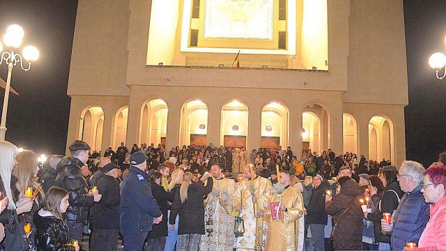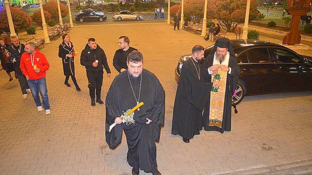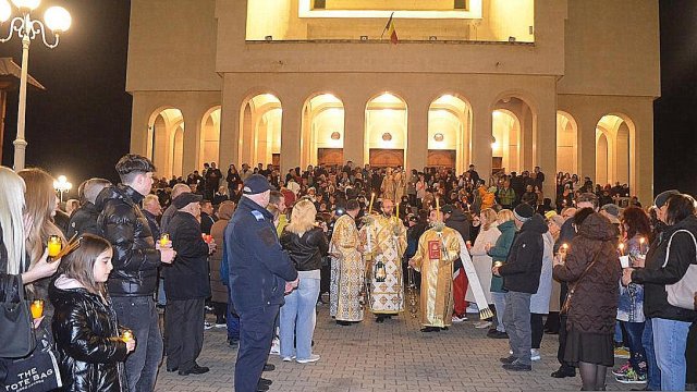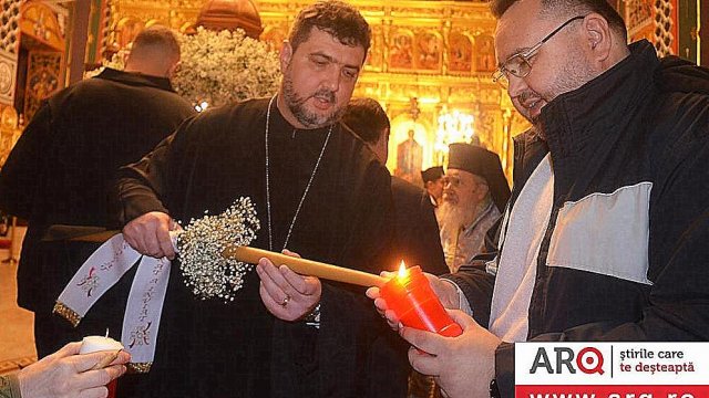 IPS Timotei i-a chemat pe credincioşi cu îndemnul „Veniţi de luaţi lumină”, apoi, de la lumânările preoţilor s-au aprins, rând pe rând, şi cele ale credincioşilor.