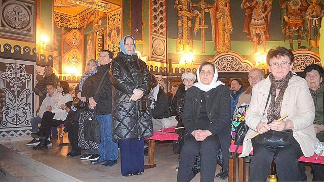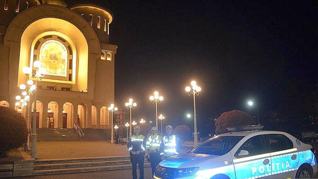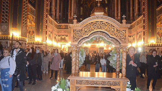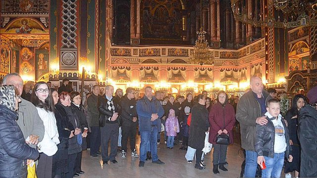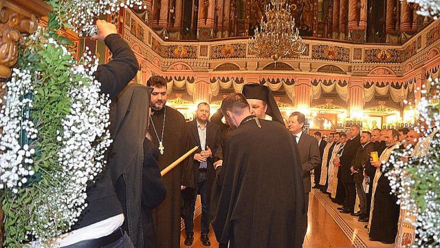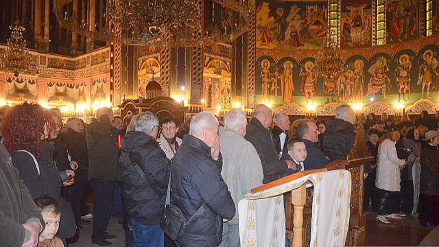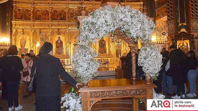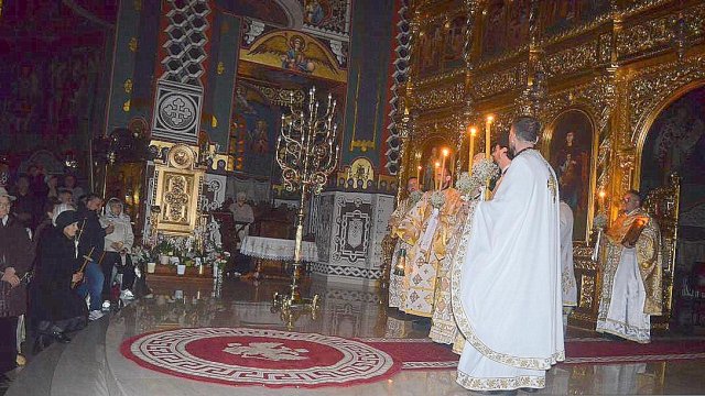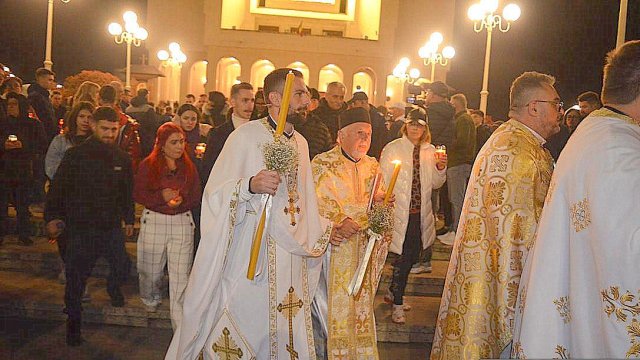 În continuare IPS Timotei, arhiepiscopul Aradului, împreună cu un sobor de preoţi şi diaconi, a oficiat slujba Învierii la Catedrala Arhiepiscopală „Sfânta Treime“.