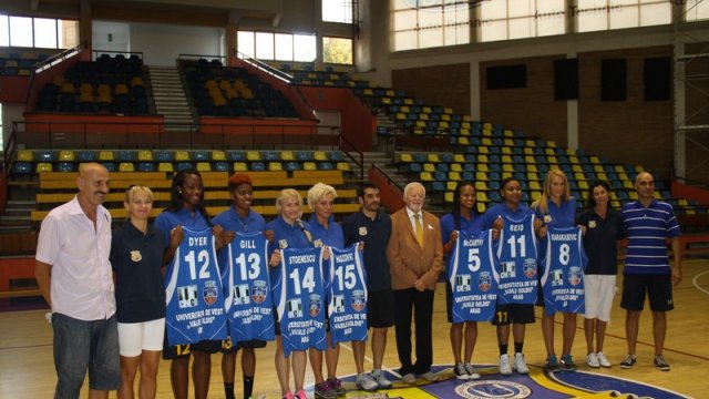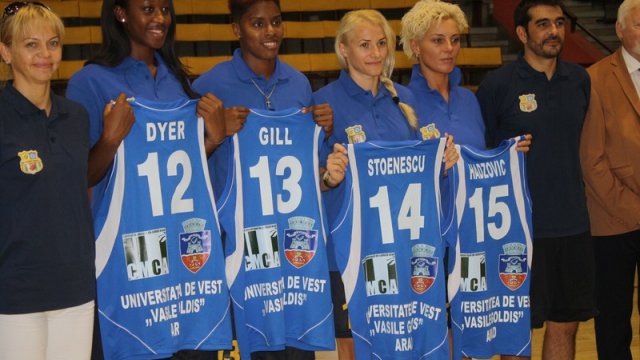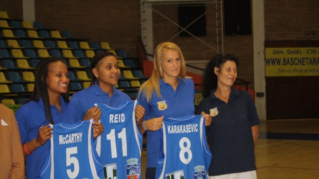 Noile componente ale Univ Goldiş ICIM Arad: Ancuţa Stoenescu, Shawnta Dyer, Monique Reid, Kristen McCarthy, Jefimija Karakasevic, Jasmine Gill şi Brankica Hadzovic au fost prezentate azi în cadrul unei conferinţe de presă, la care au mai luat parte preşedintele de onoare Aurel Ardelean, preşedinte UVVG, antrenorul Jose Araujo, preşedintele clubului Marcel Urban, consilierul tehnic Dan Moraru, noul maseur Luminiţa Pater şi noul director de imagine al clubului, nimeni alta decât Moni Brosovszky. Cea care a decis că este momentul să treacă din teren pe bancă, sau în bioruri, pentru a sprijini în continuare gruparea alături de care a cunoscut atâtea satisfacţii. "Niciodată nu eşti pregătit pentru retragere. Mulţumesc clubului că m-a ţinut lângă echopă. Voi ajuta cu tot ce pot acest club, pentru că baschetul face parte din viaţa mea. Voi spune prezent la orice solicitare", a spus minunea blondă a baschetului românesc.